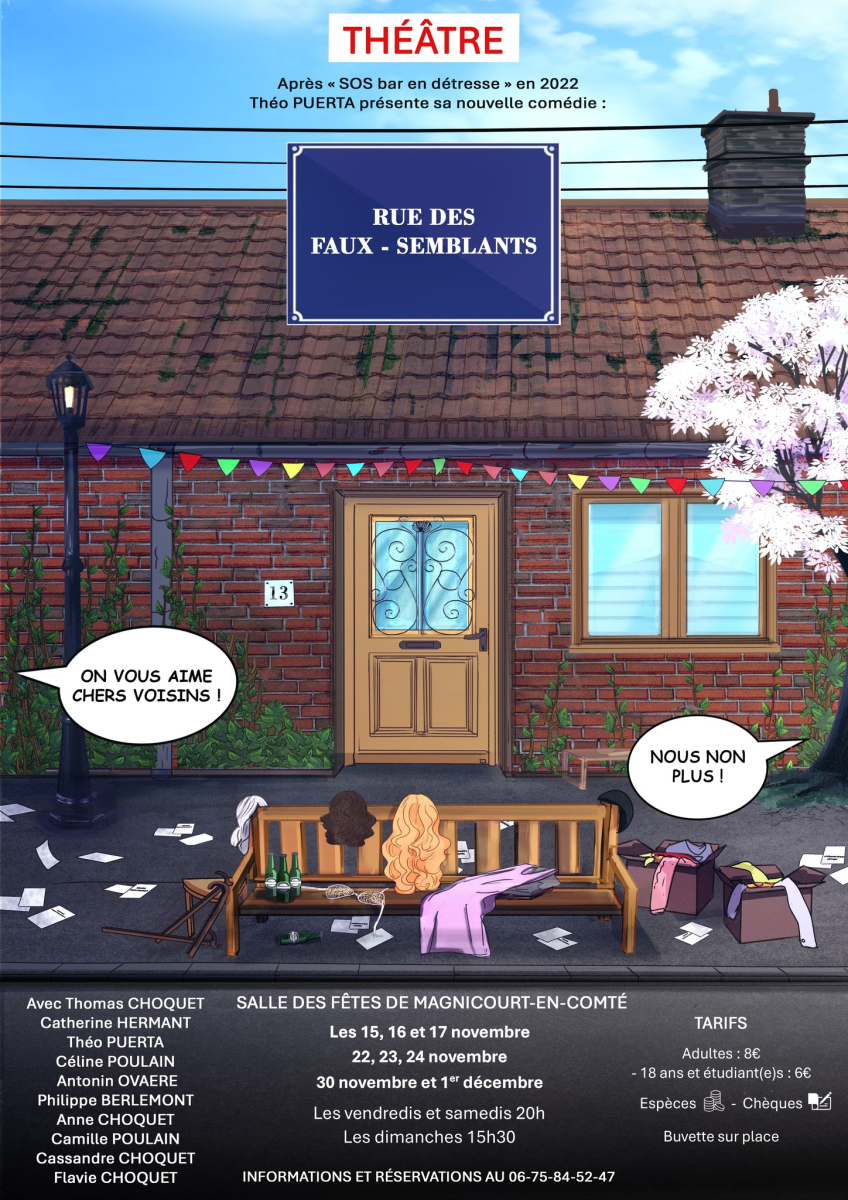 « Des quiproquos à mourir de rire », une pièce « originale avec un humour recherché », « drôle du début à la fin », « fous rires assurés »… Les premières représentations de La rue des Faux-Semblants ont conquis leur public et le bouche-à-oreille a fait le reste : « Ça se passe super bien, on a beaucoup de monde : dimanche, la salle était pleine à craquer avec 180 spectateurs ! On a de très bons retours du public, les gens ont le sourire », constate avec plaisir Théo Puerta, auteur, metteur en scène et même acteur dans cette création originale. Déjà plus de six cents spectateurs ont pu applaudir la troupe de dix comédiens sur les planches de la salle des fêtes de Magnicourt-en-Comté et il ne reste plus que deux représentations (samedi 30 novembre à 20h et dimanche 1er décembre à 15h30) de cette comédie. « Ça a été beaucoup de travail ! Mais on est fiers du résultat quand on voit l’engouement, surtout dans un petit village. » Les spectateurs se reconnaîtraient-ils dans ce vaudeville – un vaudevillage même ! – inspiré de situations réelles : « Six habitants se retrouvent lors d’une fête des voisins, ce qui donne lieu à des discussions, commérages, cancans… Une des villageoises veut partir, certains ne sont pas d’accord, d’autres s’en réjouissent, ce qui va donner lieu à des conflits », résume l’auteur, qui a trouvé son sujet dans son quotidien : « Je me suis inspiré de la vie de tous les jours. Il y a deux ans, j’ai participé à une vraie fête des voisins et je me suis dit que c’était bien de raconter cette histoire rurale. » Heureusement, cette fête s’est bien terminée, mais dans la version portée sur scène par Théo Puerta, cette réunion donne lieu à des imbroglios, incompréhension et même à des courses poursuites ! « On joue beaucoup avec les décors, il y a de l’action ! C’est du théâtre moderne, ça monte en tension et ça explose à la fin, avec un dénouement surprenant », glisse le metteur en scène, sans évidemment divulgâcher la pièce. Alors pour découvrir les personnages hauts en couleur et leurs histoires foutraques, rendez-vous ce week-end à la salle des fêtes de Magnicourt-en-Comté !